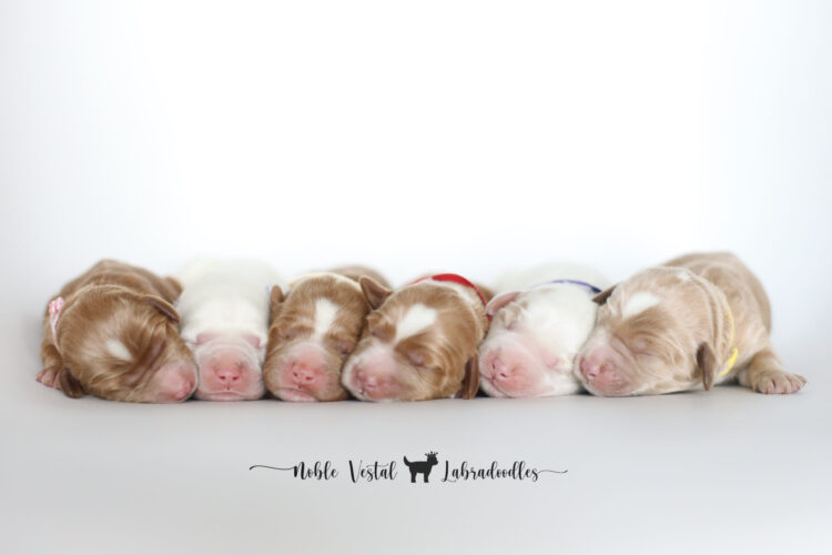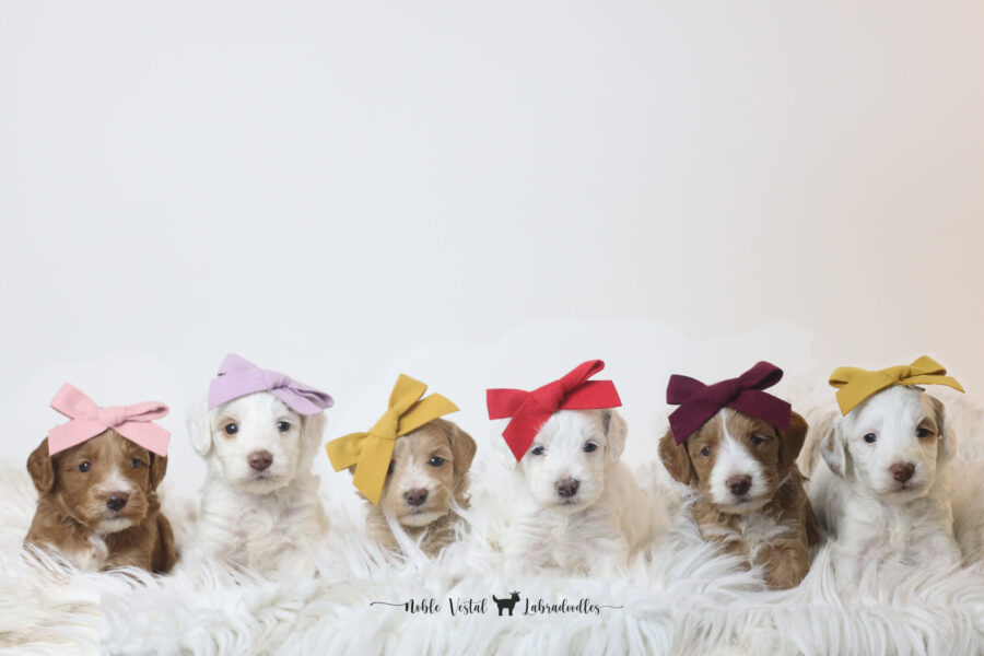 Puppies have photographed in the same order from left to right every week. Pink Girl, Lavender Girl, Yellow Girl, Red Boy, Purple Boy, Yellow Boy