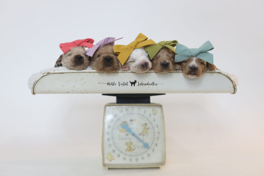 Puppies have been photographed weekly in the same order from left to right. Pink Girl, Lavender Girl, Yellow Girl, Green Girl and Teal Girl.