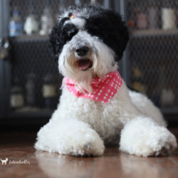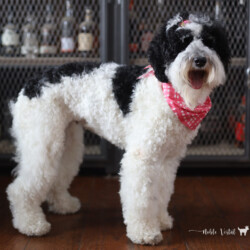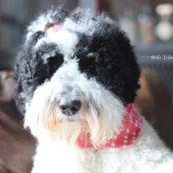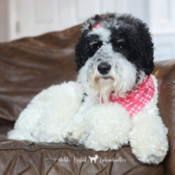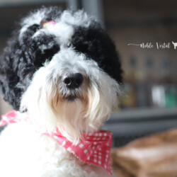 Noble Vestal’s Ima Major Babe is an incredible girl! Baby is highly intelligent and has two modes, Play and Still. If she isn’t playing with her BFFs she is still-fully watching a squirrel, bird or something in the far off distance that you can’t see. She is a loyal companion who loves her people. Baby is tall and has a beautiful fleece coat of curls that are soft and silky. Baby is a Tri color with very light tan points on her face, feet and fanny. Baby can produce parti, phantom and tri patterned puppies.